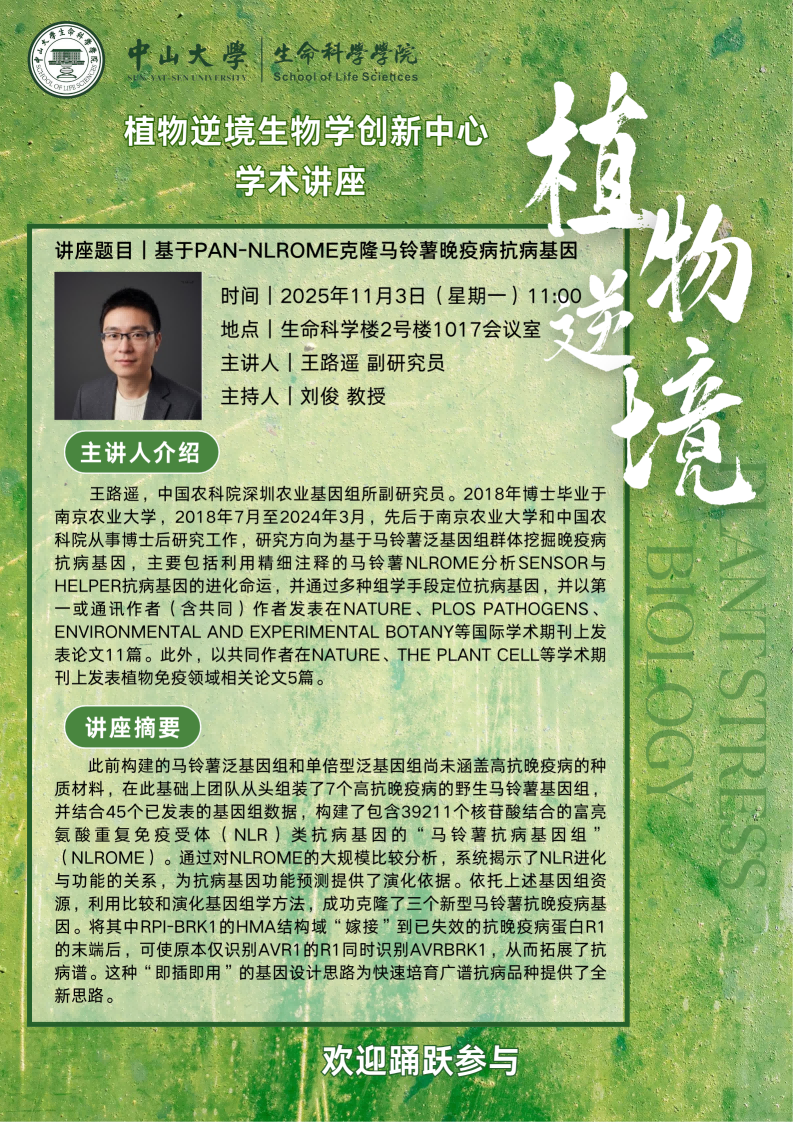 2025年11月3日赌博app 植物逆境生物学创新中心系列讲座:基于Pan-NLRome克隆马铃薯晚疫病抗病基因