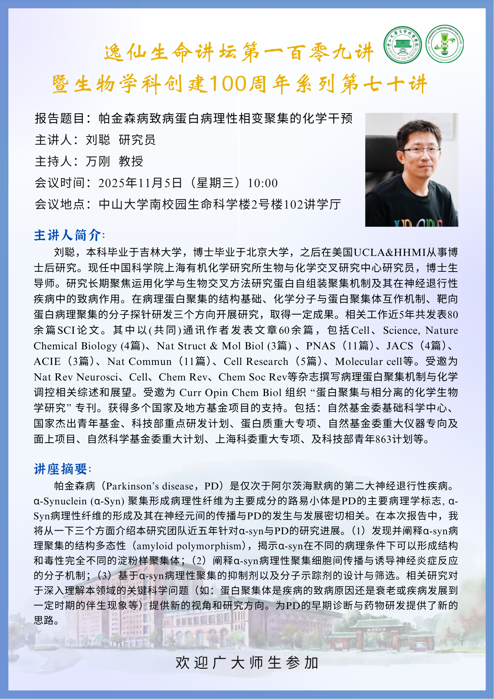 2025年11月5日赌博app 逸仙生命讲坛第109讲:帕金森病致病蛋白病理性相变聚集的化学干预