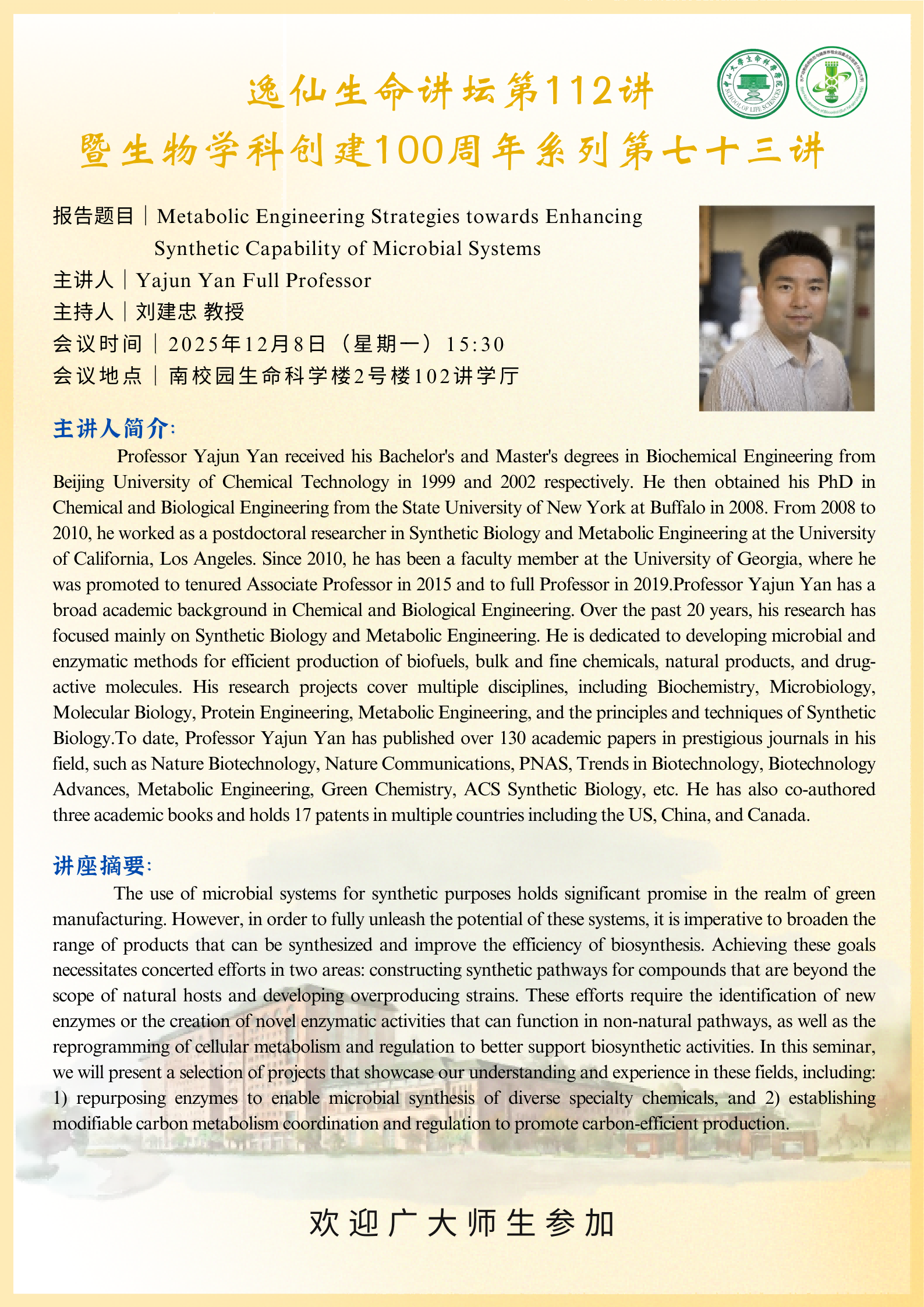 2025年12月8日赌博app 逸仙生命讲坛第112讲:Metabolic Engineering Strategies towards Enhancing Synthetic Capability of Microbial Systems