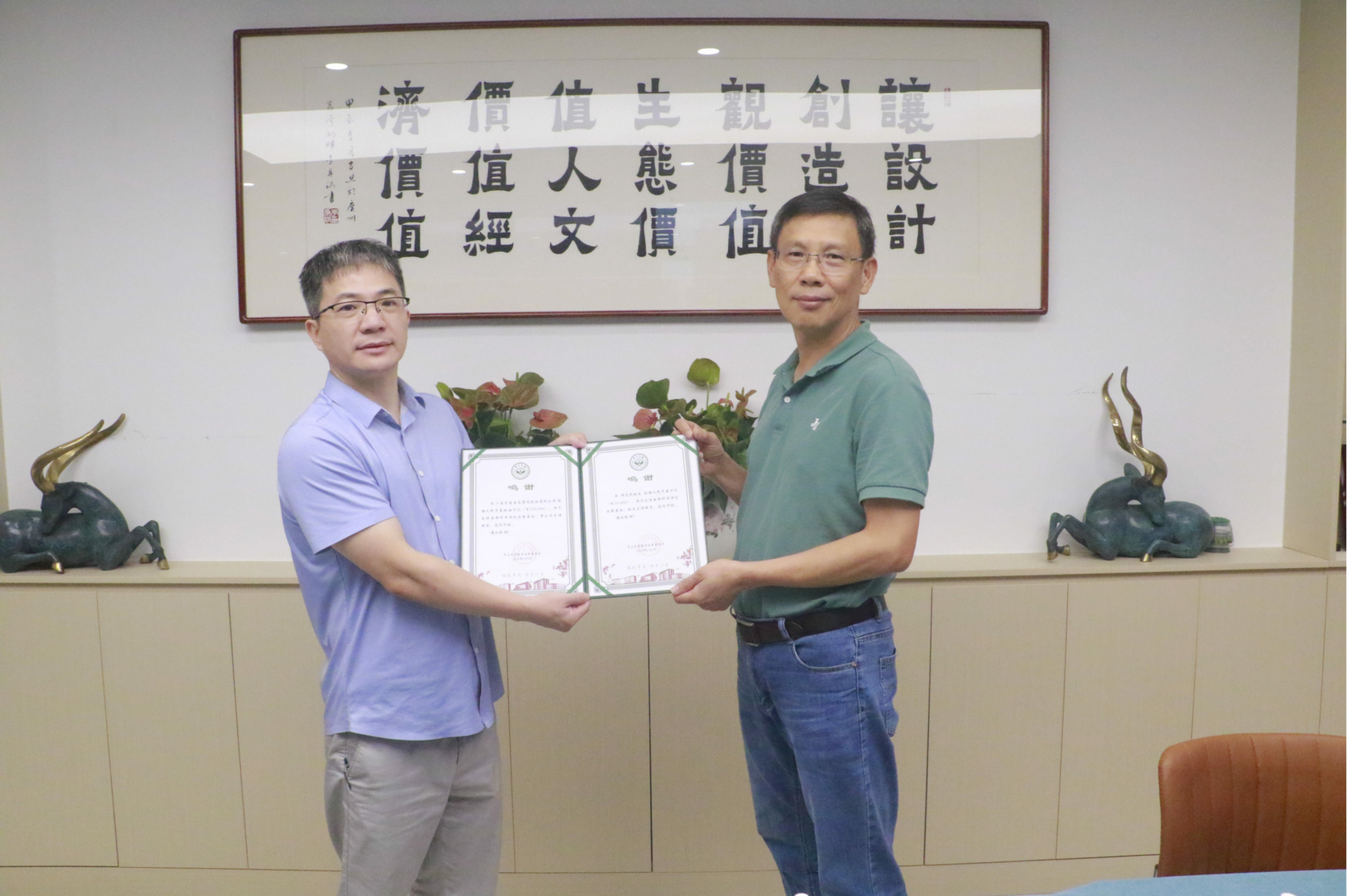 座谈会上,周先武校友介绍了公司的发展情况,双方在景观规划、构树研究等进行了深入的交流讨论。此外,为了感谢周先武校友捐赠设立匠造生态奖学金和支持赌博app 发展基金,支持学院的教育事业发展,贺雄雷院长向周先武校友颁发了捐赠鸣谢证书及赠送纪念品,以表达学院对周先武校友的深切感谢。