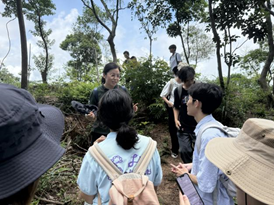 实习第一站是路环九澳高顶烧烤公园的中央山,这里设有土坑法生态恢复实验样地。土坑法是一种通过挖掘沟槽收集雨水、增强土壤蓄水能力的技术,能有效缓解季节性干旱对植被的影响,在这里周婷老师先是为同学们讲述了这些土坑来源以及十几年前用土坑法进行生态恢复的尝试。随后,周婷老师又联系课堂知识生动地为同学们展示了土坑法的原理和实践意义。